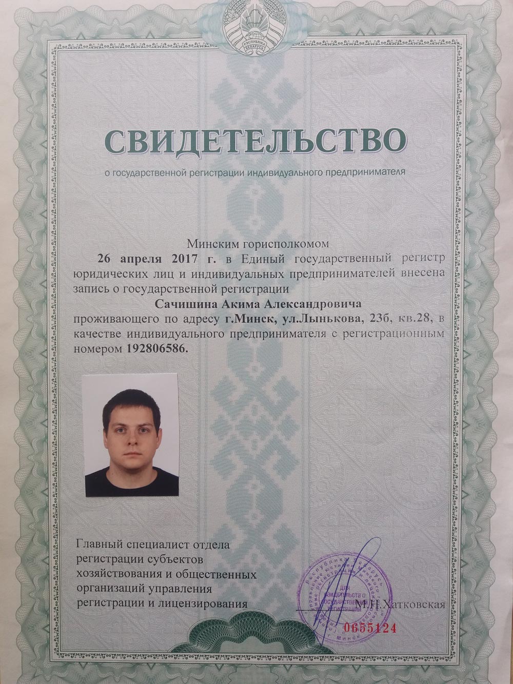 Свидетельство о государственной регистрации индивидуального предпринимателя Минским горисполкомом от 26 апреля 2017 года, УНП 192806586