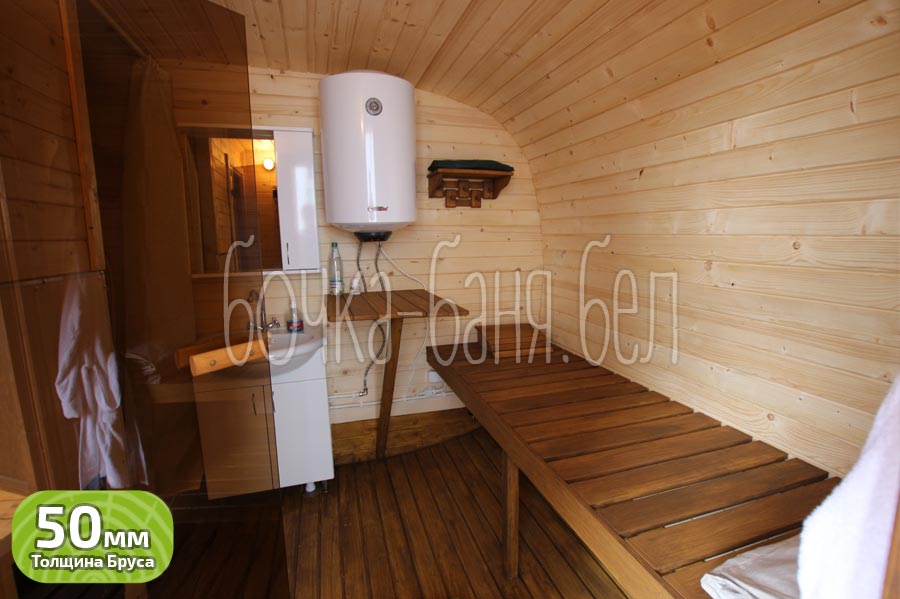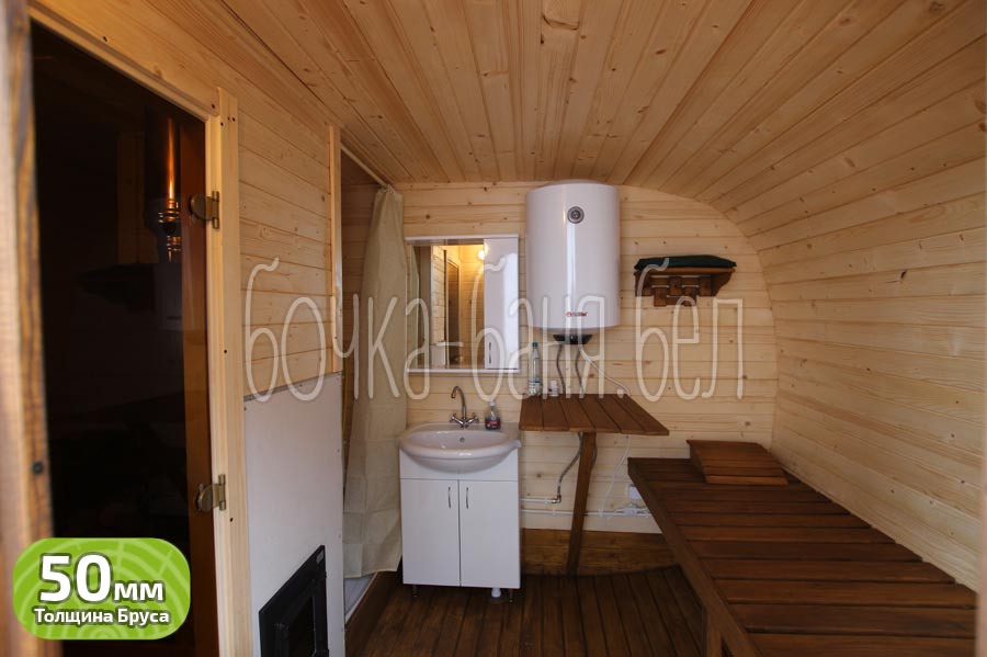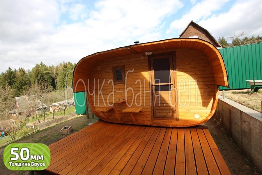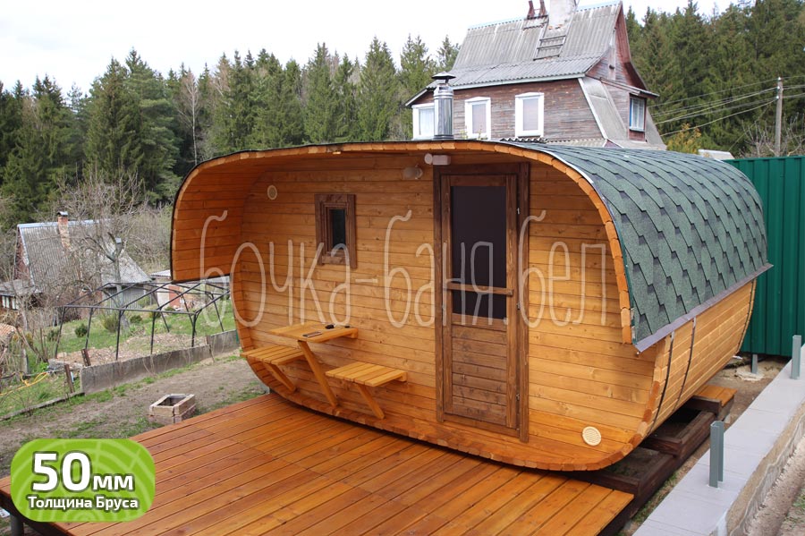 Модель: овальная баня-бочка 3x4 метра с террасой.