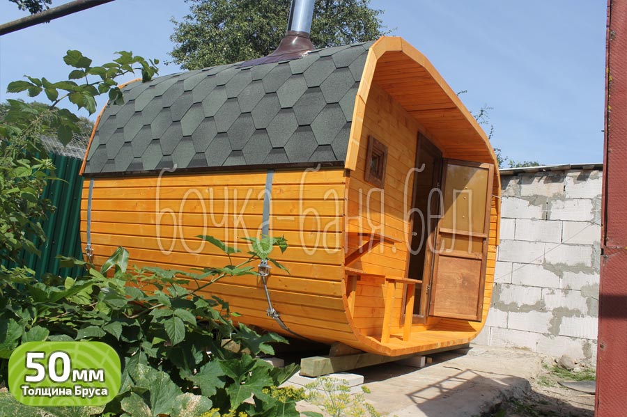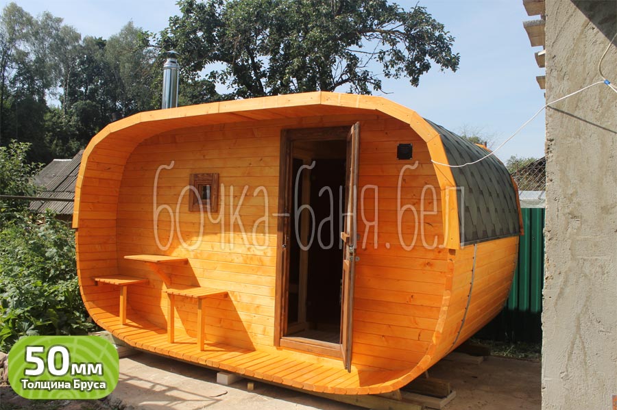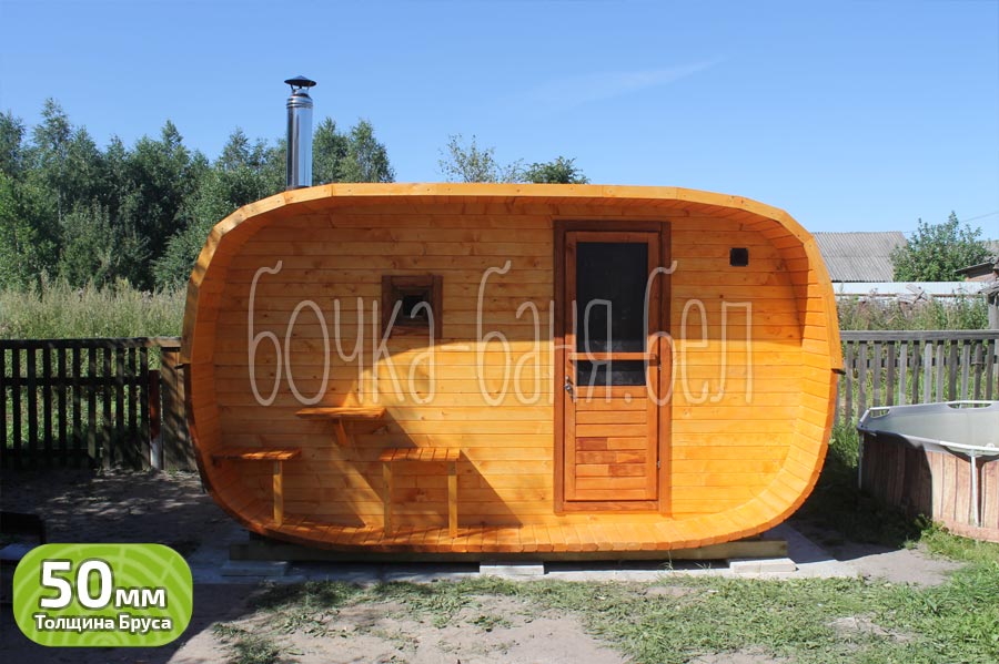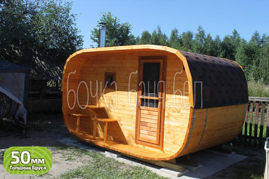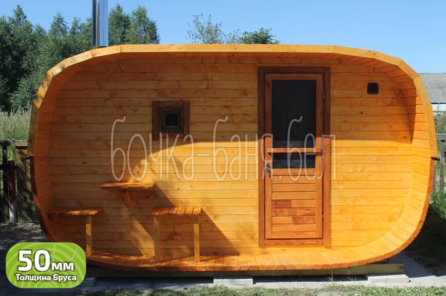Модель: овальная баня-бочка 2,5x4 метра с террасой.
